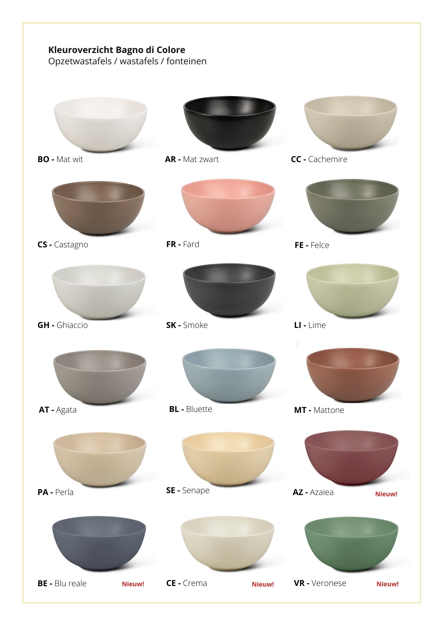De naam zegt het al: kleur in de badkamer! Het ruime keramiek assortiment van Globo is grotendeels verkrijgbaar in de vrolijke Bagno di Colore kleuren. Het pallet van 18 kleuren bestaat uit neutrale aardetinten als beige en bruin, maar bevat ook uitgesproken kleuren als roze, baby blauw en bordeaux rood. Bekijk het gehele overzicht onderaan deze pagina.