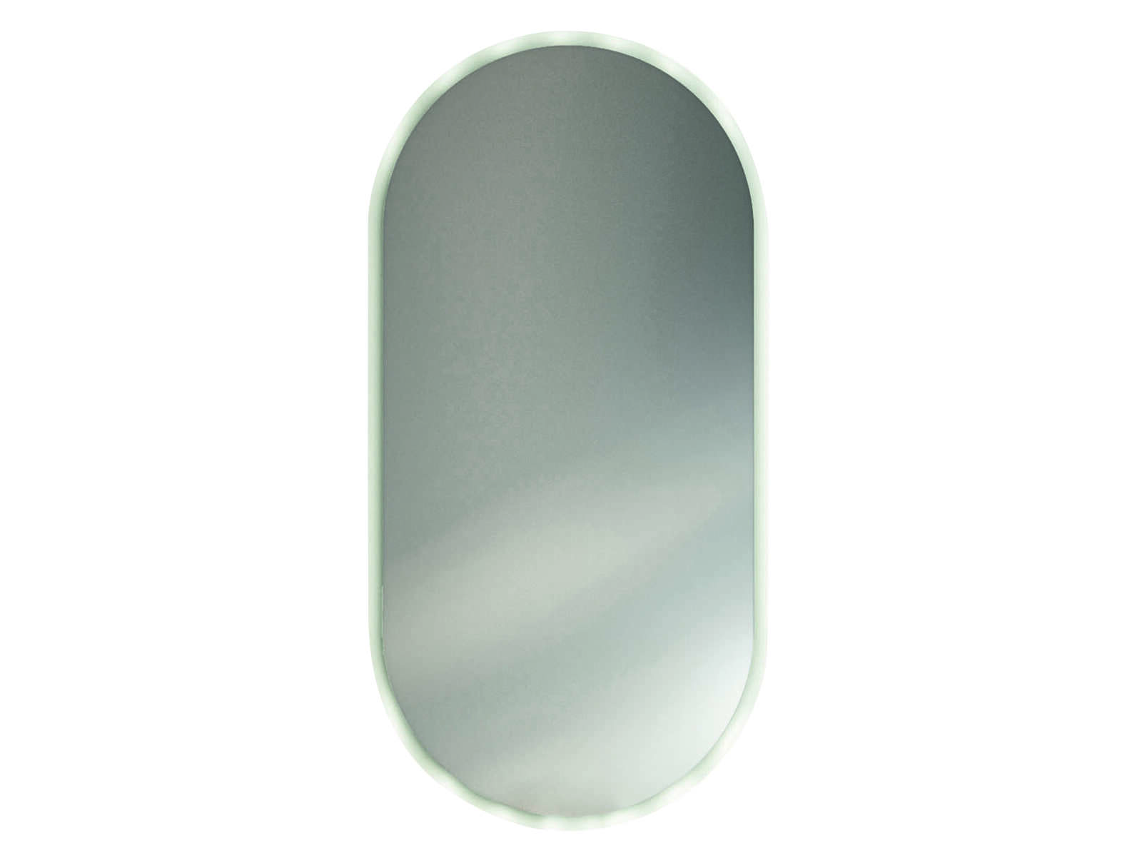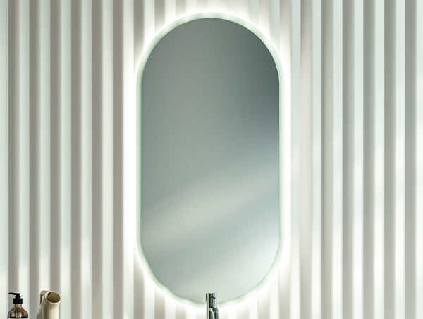 Elegante ovale spiegel van 50x100 cm met geïntegreerde LED-verlichting aan de achterzijde. Het indirecte licht creëert een zachte gloed en geeft de badkamer een moderne en sfeervolle uitstraling.