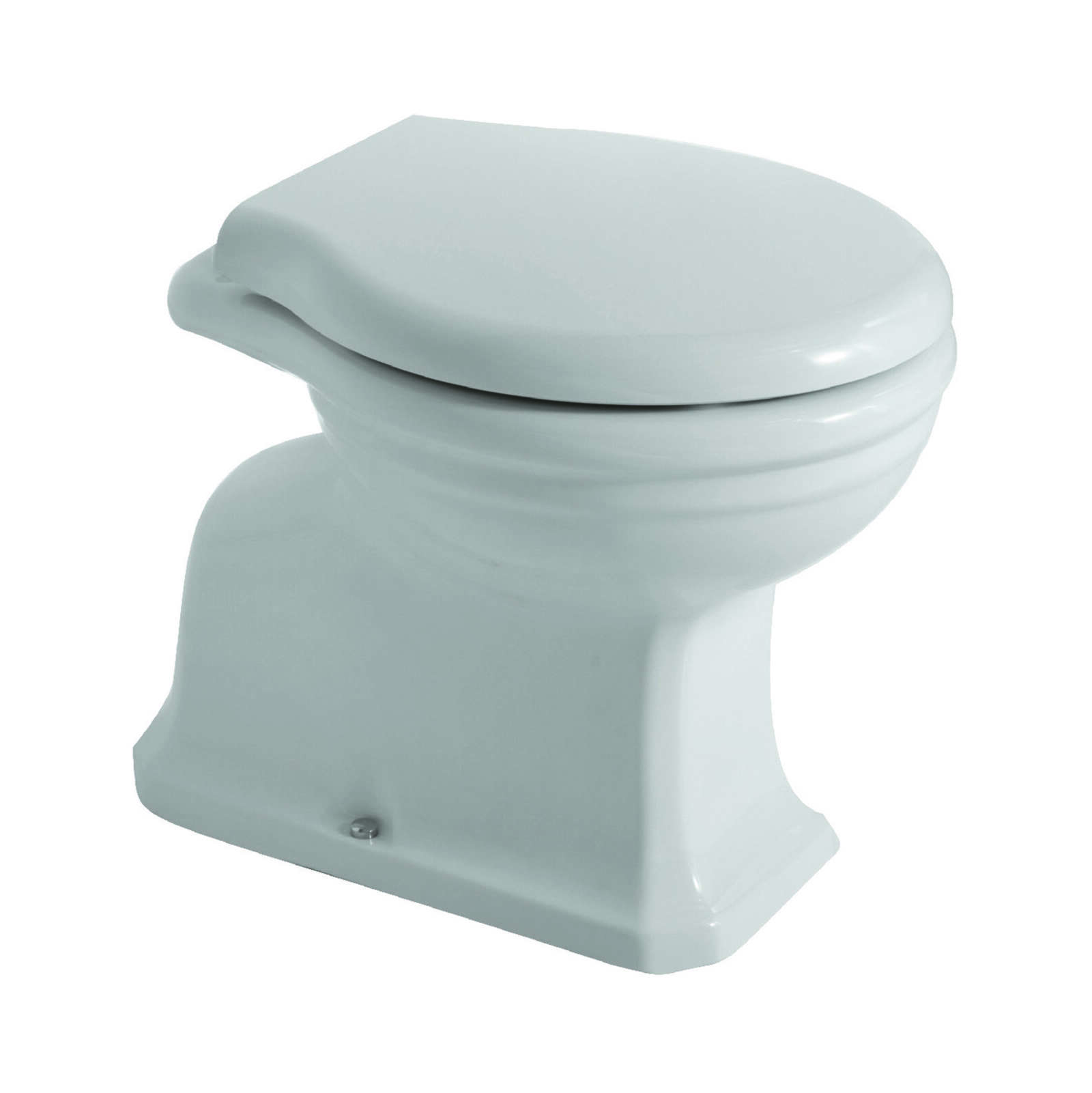 Klassiek toilet 57x37 cm, geschikt voor zowel hoog- als laaghangende reservoirs. Met afvoer naar de vloer voor een traditionele badkameropstelling. Tijdloos design en solide keramiek voor een betrouwbare en stijlvolle keuze.