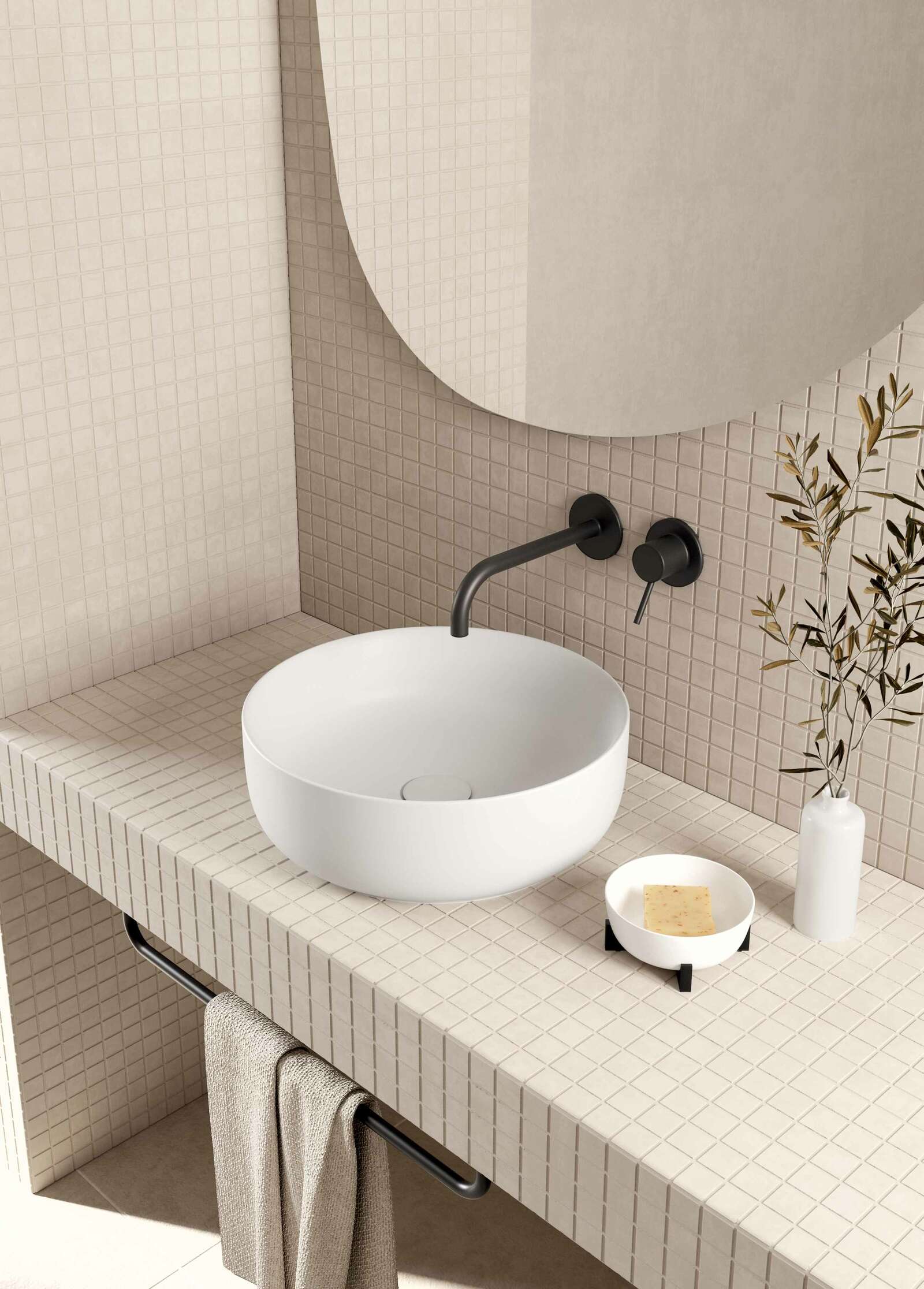 Opzetwastafel 42x42x11 cm, zonder overloop. Ideaal voor een stijlvolle, compacte wastafelopstelling.