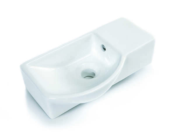 Strak en praktisch: deze fontein van keramiek wordt rechts geplaatst. meet 40x22x12 cm en is uitgevoerd zonder kraangat, waardoor je zelf de perfecte kraan kunt kiezen en plaatsen.