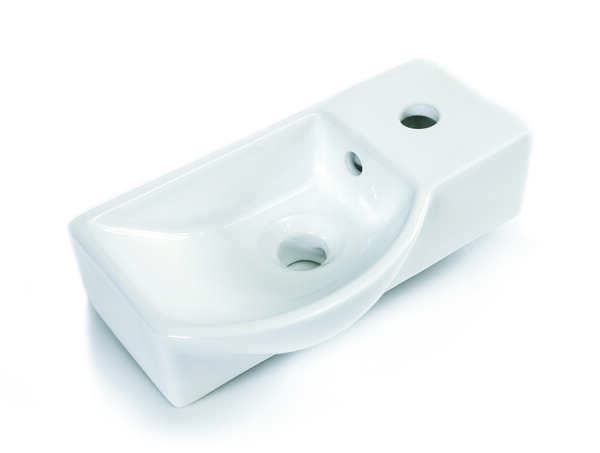 Strak en praktisch: deze fontein van keramiek wordt rechts geplaatst, meet 40x22x12 cm en is uitgevoerd met kraangat, waardoor je zelf de perfecte kraan kunt kiezen en plaatsen.