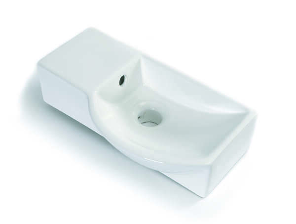 Strak en praktisch: deze fontein van keramiek wordt links geplaatst. meet 40x22x12 cm en is uitgevoerd zonder kraangat, waardoor je zelf de perfecte kraan kunt kiezen en plaatsen.
