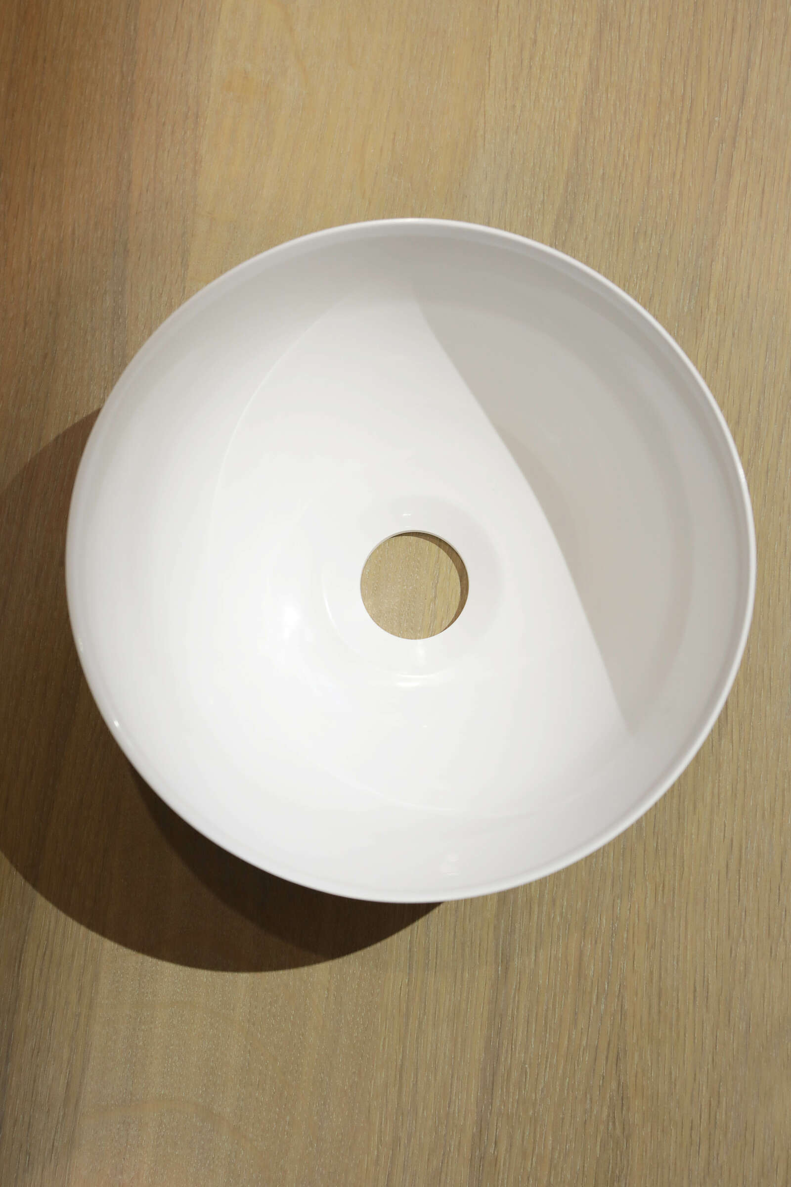 Minimalistisch en elegant, deze ronde opzetwastafel met een dunne rand is een verfijnde toevoeging aan elke toiletruimte. Met een formaat van 24x24x12 cm combineert deze fontein een strak design met praktisch gebruiksgemak.