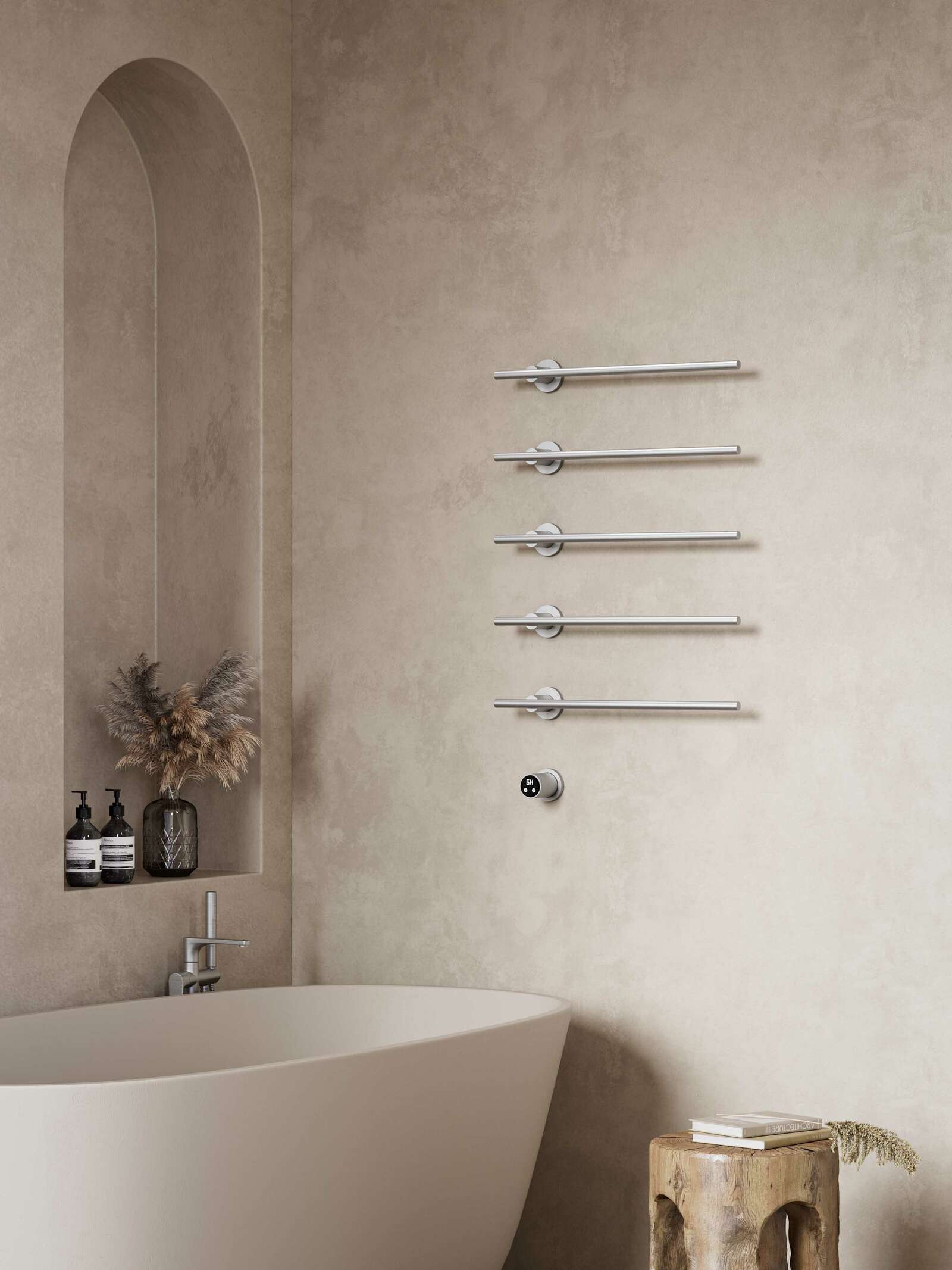 De SAX elektrische handdoekwarmer met 5 stijlvolle stangen biedt maximale capaciteit en comfort voor de badkamer. Ideaal voor het gelijktijdig verwarmen van meerdere handdoeken. De geïntegreerde timerbediening zorgt voor eenvoudig gebruik en automatische uitschakeling. Het slanke ontwerp en de hoogwaardige afwerkingen maken deze handdoekwarmer tot een luxe en functionele toevoeging aan iedere badkamer. Verkrijgbaar in Chroom, Geborsteld nikkel, Geborsteld koper PVD, Gun metal PVD, Champagne goud PVD en Tuscany.