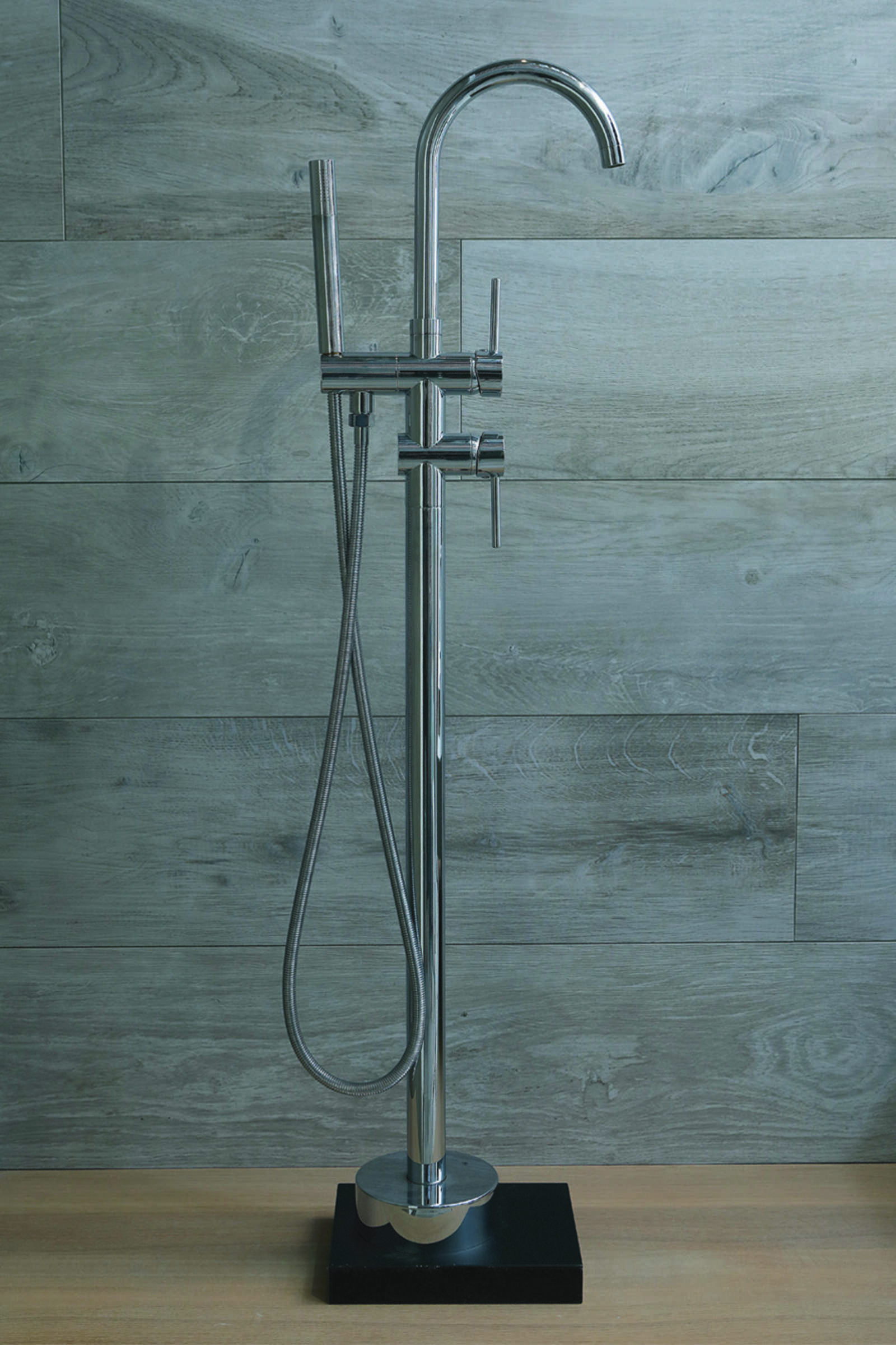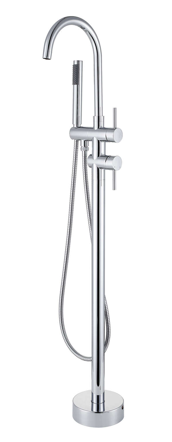 Deze vrijstaande badkraan met ronde uitloop is een elegante toevoeging aan elke vrijstaande badopstelling. De kraan is voorzien van een pingreep voor eenvoudige bediening en wordt geleverd met een bijpassende handdoucheset voor extra gebruiksgemak.