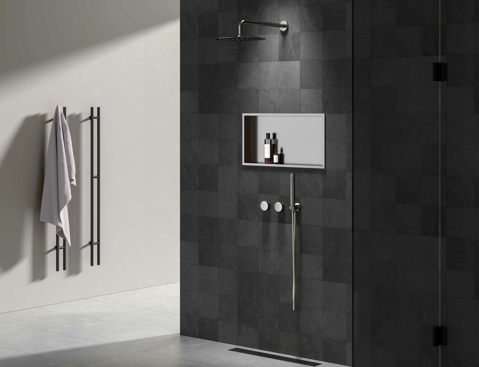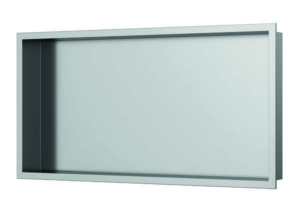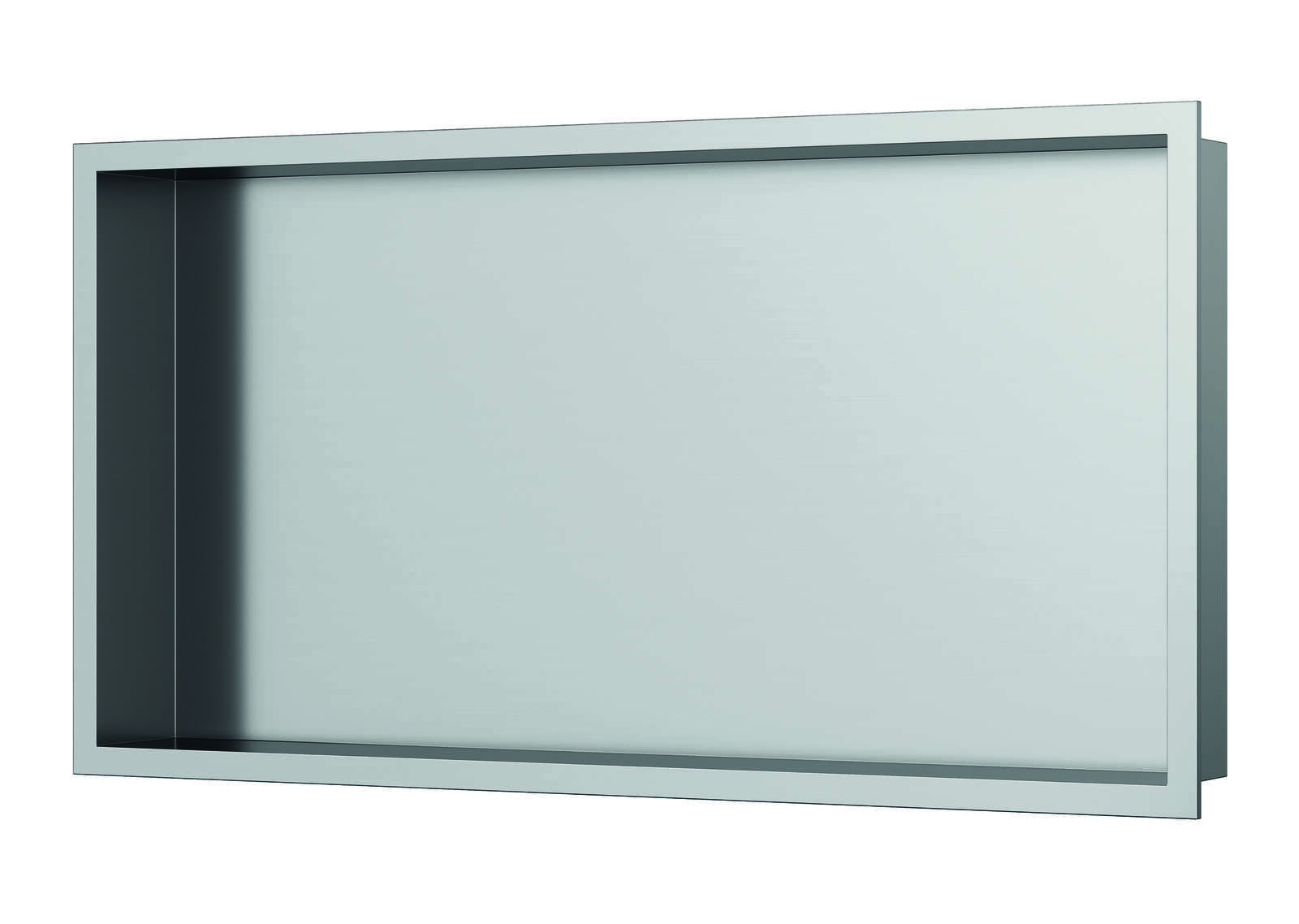 Moderne, strakke wandoplossing voor extra opbergruimte in vochtige ruimtes zoals de badkamer of douche. Gemaakt van hoogwaardig roestvrij staal, bestand tegen vocht en eenvoudig te reinigen. Geschikt voor inbouw in tegelwerk of gestucte muren voor een naadloze afwerking.