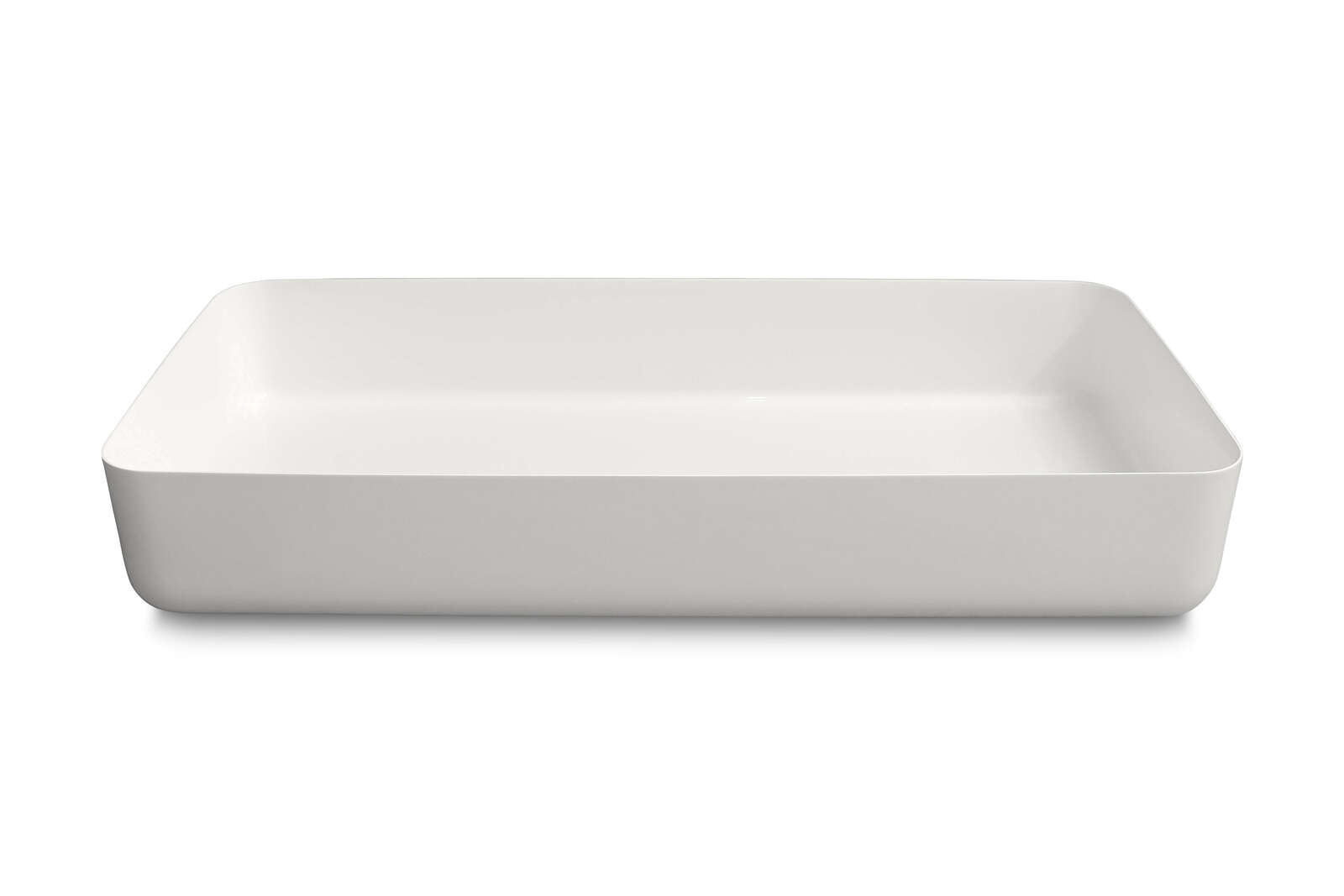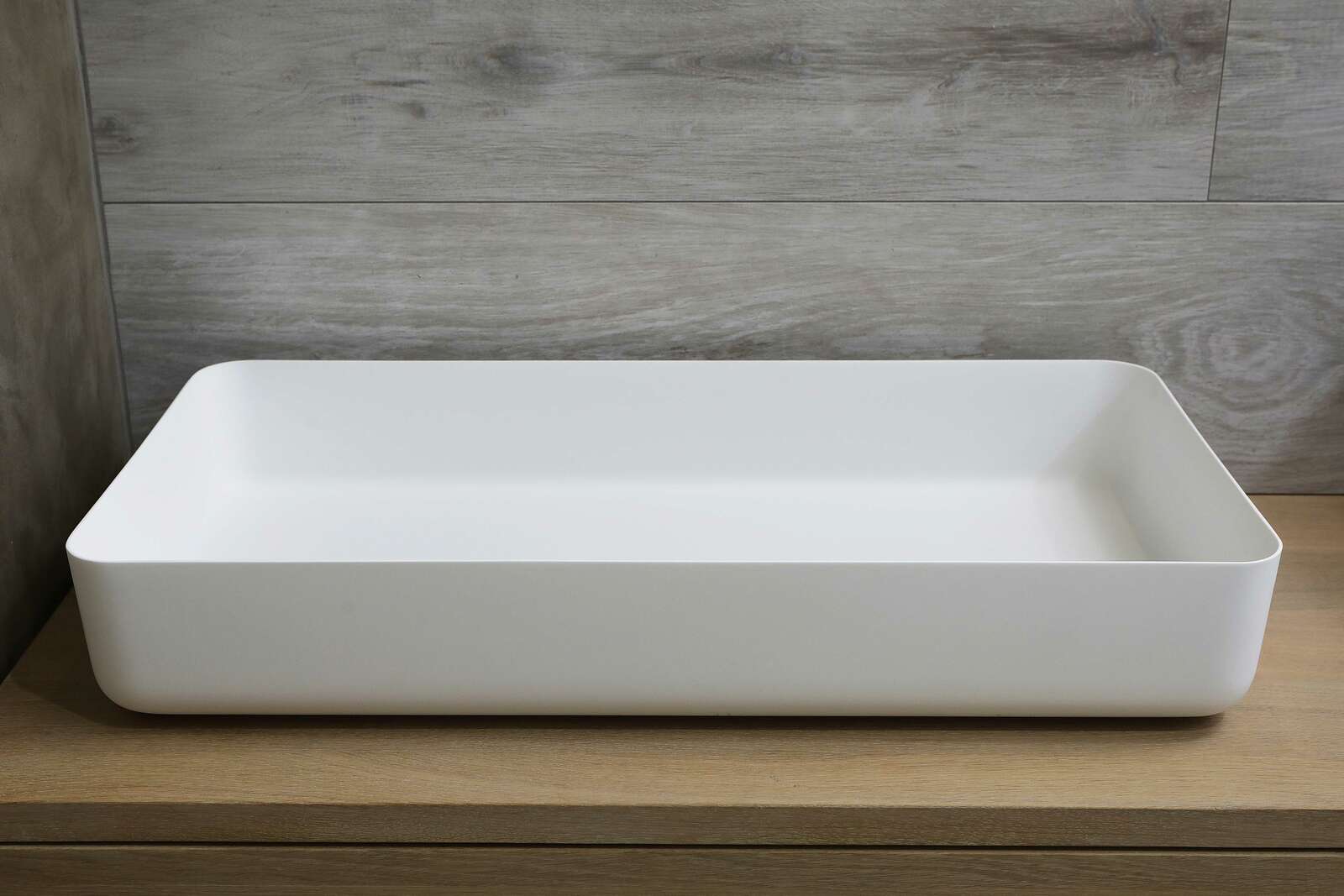 Deze ruime rechthoekige opzetwastafel van mineral stone / solid surface combineert strak design met functionaliteit. Met zijn afmetingen van 80 x 40 cm en een hoogte van 13,5 cm is hij ideaal voor een moderne badkamer waar ruimte en stijl samenkomen.