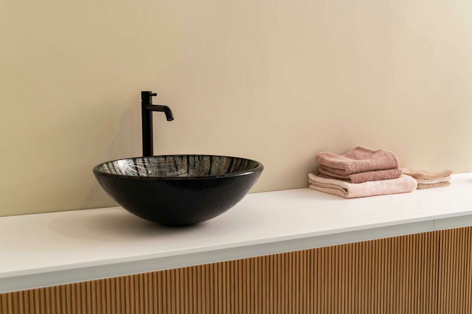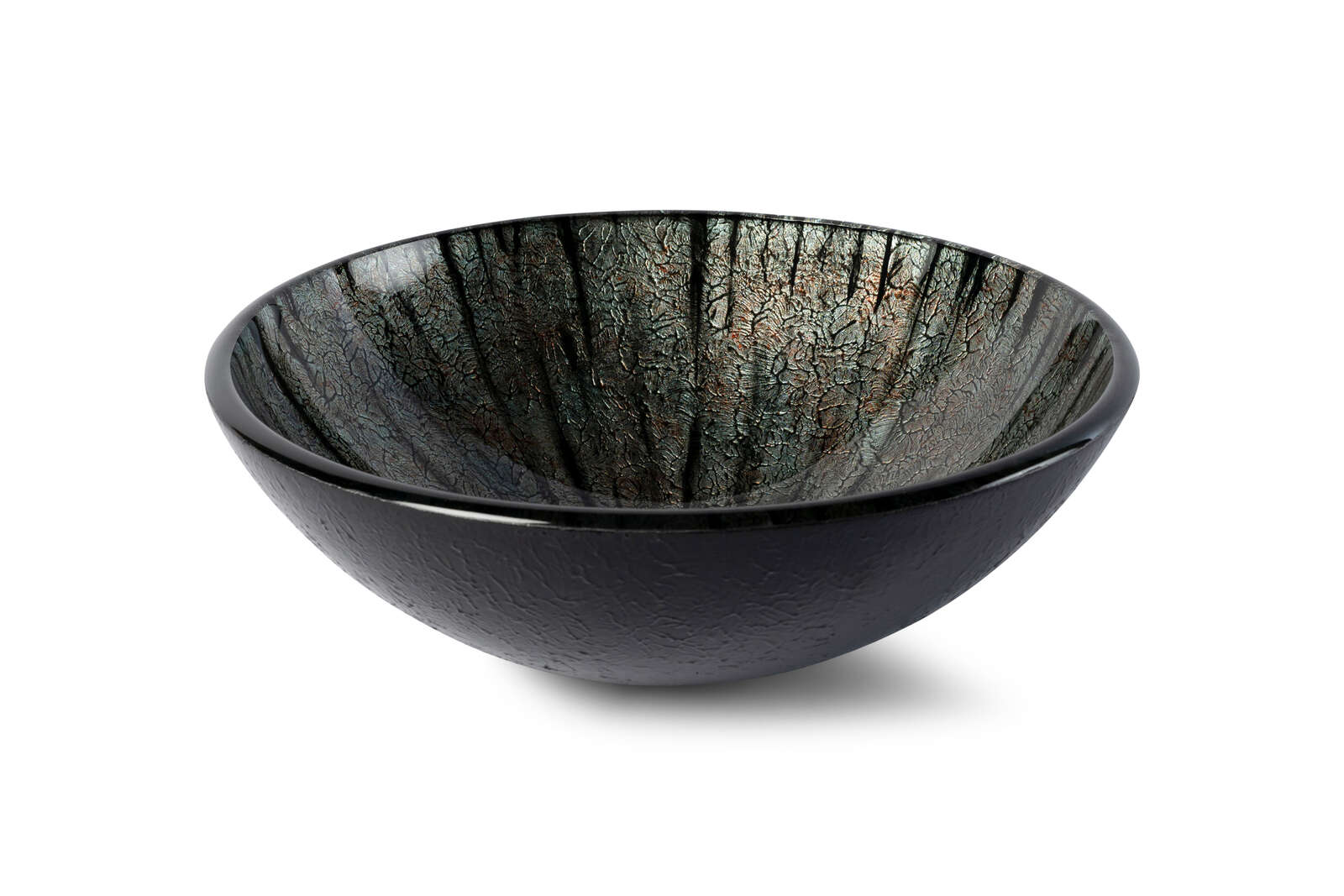 Opzetwastafel rond 42x42x14,5h van gehard glas met zwarte wastafelhouder. Kleur multicolour/black voor een opvallend en stijlvol effect in je badkamer. Modern design dat functionaliteit combineert met een speelse touch.