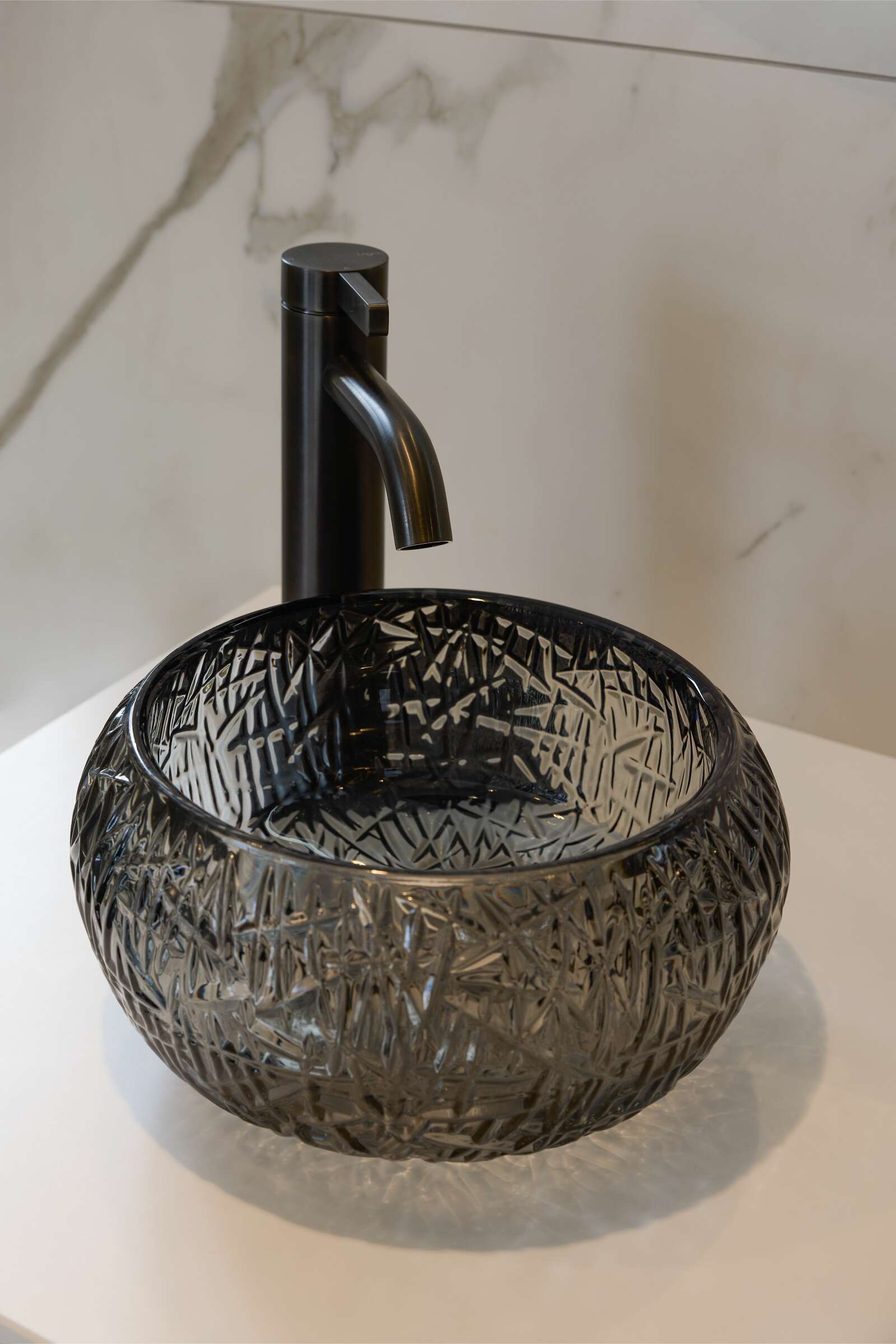 De fontein in de kleur Smoke combineert elegantie met een vleugje mysterie. Het subtiel grijsgetinte glas weerspiegelt het licht op een zachte, verfijnde manier en geeft je badkamer een moderne, rustgevende uitstraling.