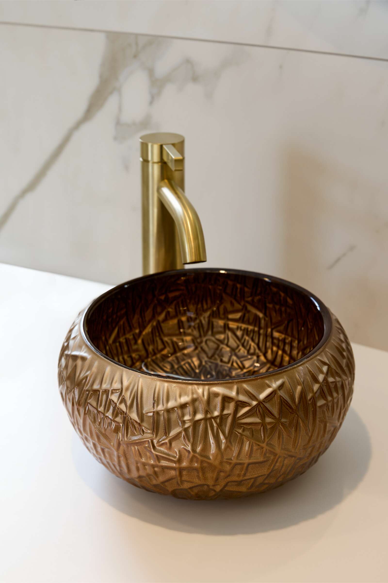 De fontein in de kleur Chestnut straalt de warmte uit van natuurlijk hout, gevangen in glas. De bruine tint brengt karakter en geborgenheid in je badkamer, zonder in te boeten aan verfijning. Met haar ronde vorm en zachte glans vormt ze een subtiel statement: warm, puur en met een vleugje luxe.